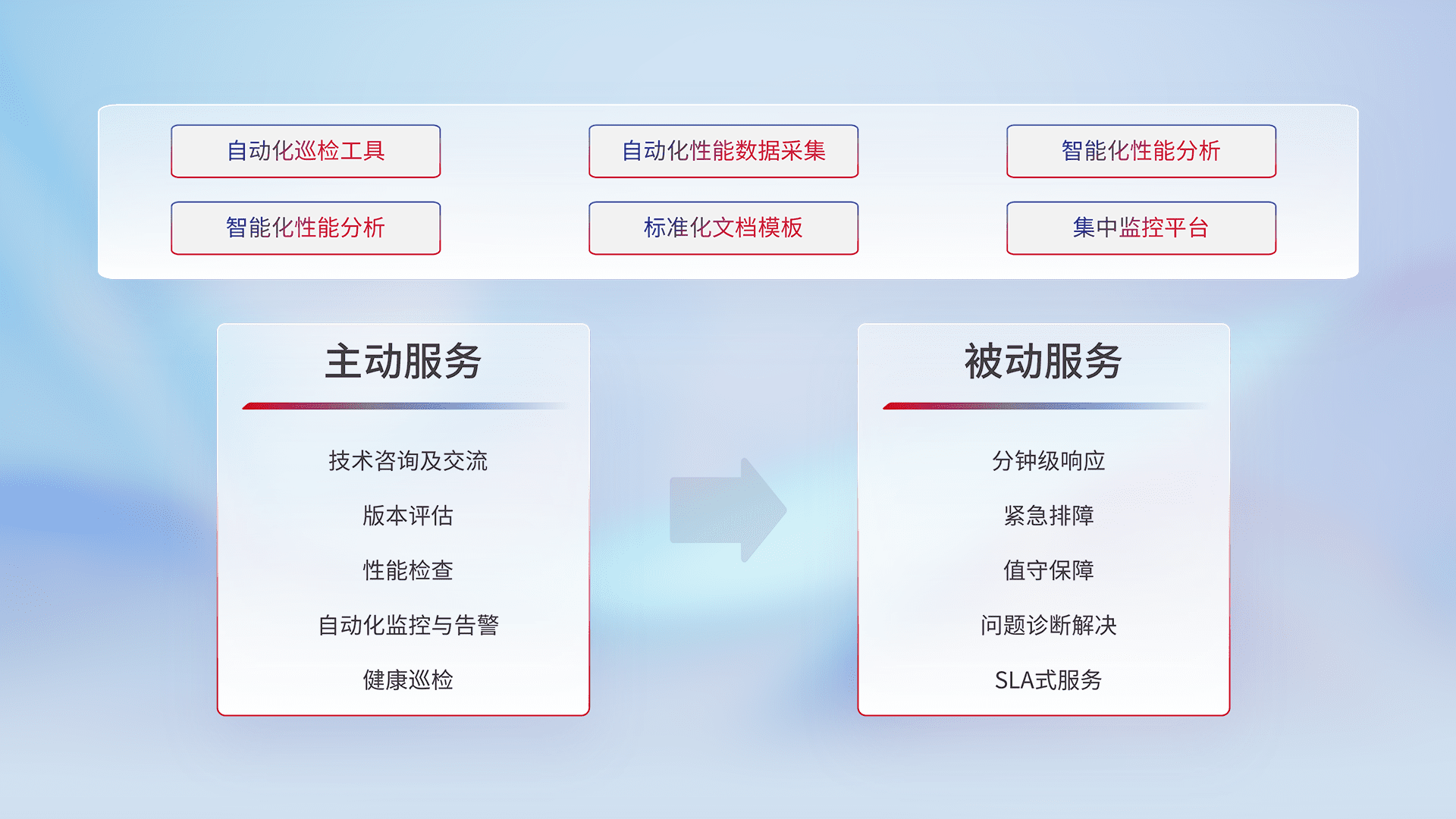 智能化工具和标准化文档,,保障服务质量,,提供主动服务(包含技术咨询、、、版本评估、、、性能检查、、、自动化监控与告警、、健康巡检)和被动服务包含(分钟级响应、、、紧急排障、、、值守保障、、问题诊断解决、、SLA服务)。。