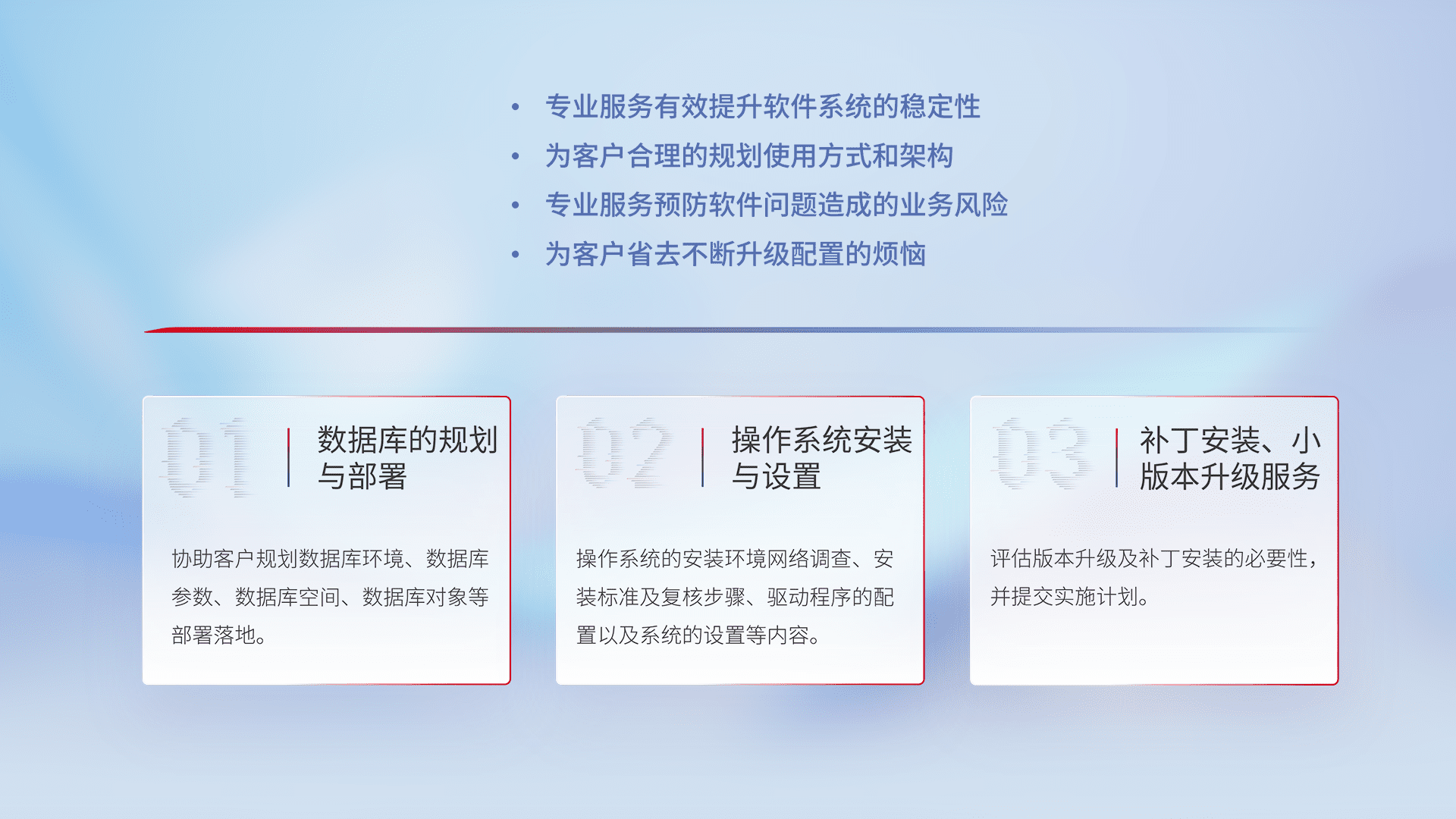 为客户提供软件规模升级、、、、快速部署、、、按需配置的专业服务,,,,从数据库的规划与部署到操作系统的安装与设置,,,再到补丁安装和小版本升级提供支持。。